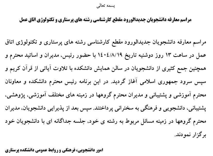 مراسم معارفه دانشجویان جدیدالورود مقطع کارشناسی ساعت 13 روز دوشنبه 19 آبان